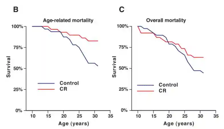 早在1989年开始,科学家们就对人类的近亲——恒和猴进行了长达二十年的饮食热量限制实验。结果发现: