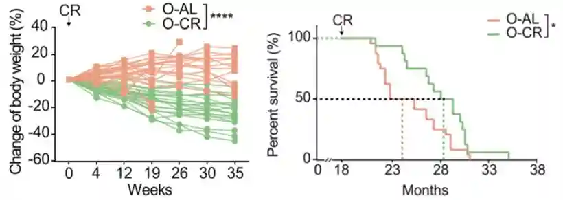 2020年2月,中国科学院动物研究所研究员刘光慧教授团队发表在《cell》期刊上的文献报道,在针对小鼠饮食限制的一项临床研究中,进行了30%饮食限制的小鼠不仅体重比对照组降低了三分之一(28.7~36.5%),而且寿命的的中位值和最大值也延长了!