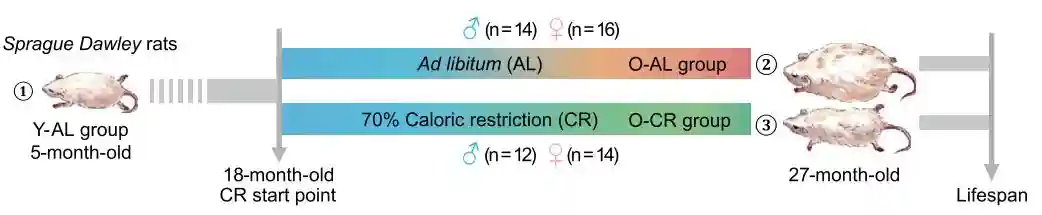 这篇文章的研究对象是啮齿类动物大鼠(Rattusnorvegicus),他们将18月龄的大鼠平均分配为两组,一组正常喂养,另一组限制热量,仅喂食正常饮食的70%。