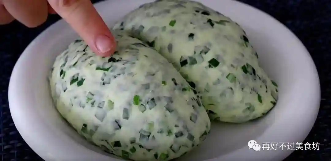 5、现在韭菜也已经腌好了,往里加入适量的面粉,先用筷子充分搅拌均匀,再分次少量加入清水,边加边搅拌,搅拌成没有干面粉的小絮状,再揉成软硬适中的光滑面团,面团揉好之后,分成小块放入盘中备用。