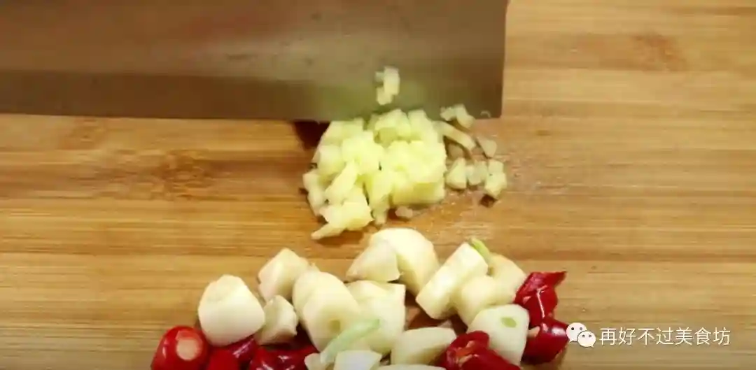 5、再准备三个小米椒,把它切成辣椒圈,一把大蒜切成蒜粒,一块生姜,先切成姜片,再切成细细的姜丝,然后切成姜末,全部切好以后装入盘子里。