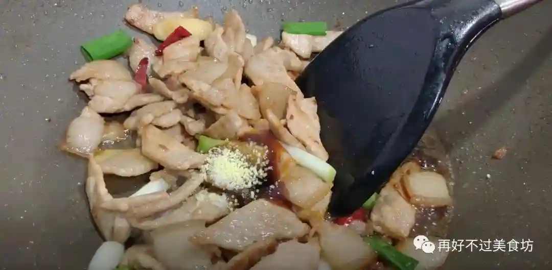 5、肉片炒熟之后,把小料倒进来,搅拌均匀,炒出小料的香味,再来调味,生抽适量,蚝油适量,适量的盐,适量的鸡精,再次充分地炒拌均匀。