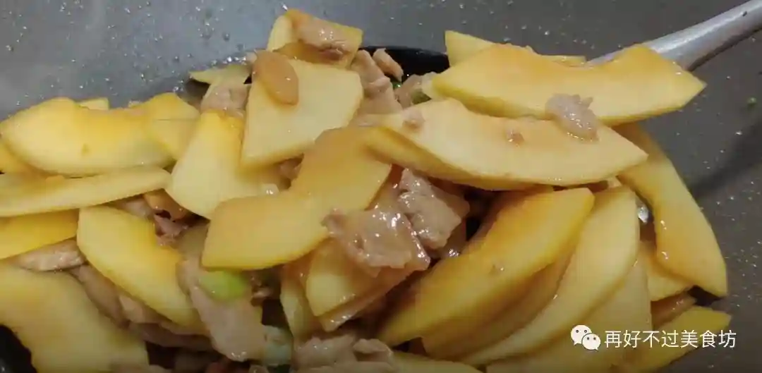 6、最后把木瓜放进来翻炒均匀,再加入一点点清水,等木瓜炒至断生,就关火盛出来,一道非常好吃又简单的木瓜炒肉片就做好了。