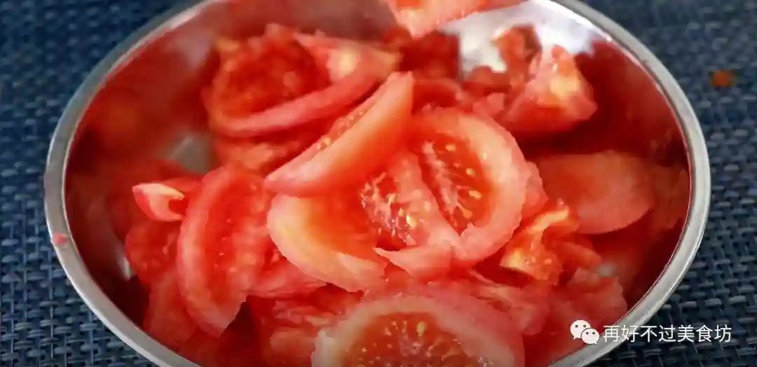 4、现在番茄也烫好了,烫好之后撕掉外皮,再直接切到盘中,这样汁水不会流得到处都是。