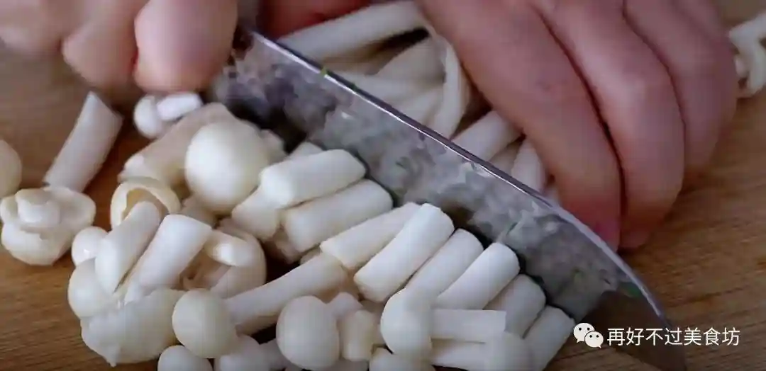 3、准备一把海鲜菇,先是给它清洗干净,然后切成小段,放入盘中备用。