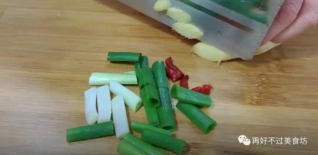 3、再来切点料头,葱切成段,喜欢吃辣的,可以再放入两个辣椒,再切入两三片姜,切好放小碗中备用。