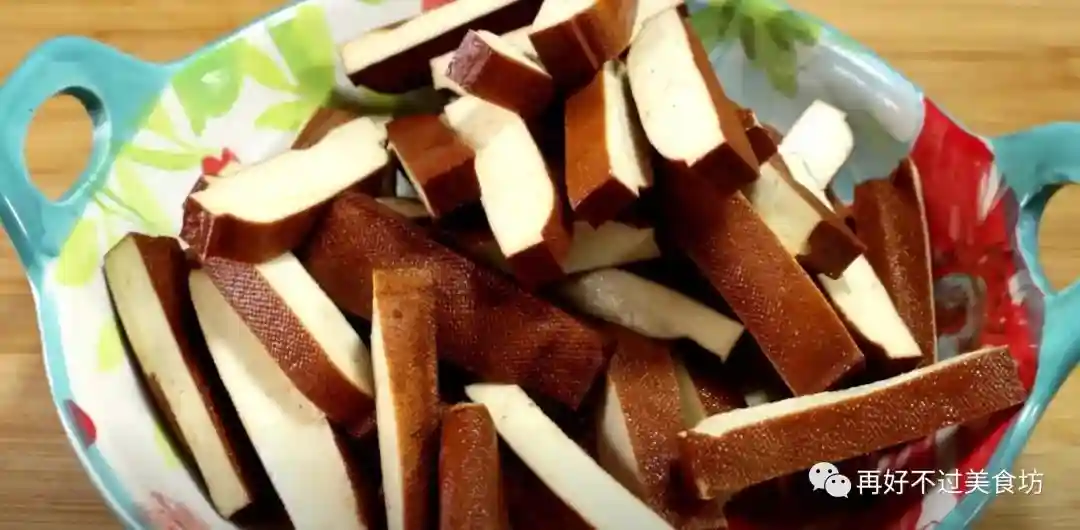 3、接下来准备一块钱的香干,把香干切成厚厚的薄片,这种香干吃起来非常的香,搭配上芹菜,孩子每次都可以吃两碗饭,先装入盘子里。