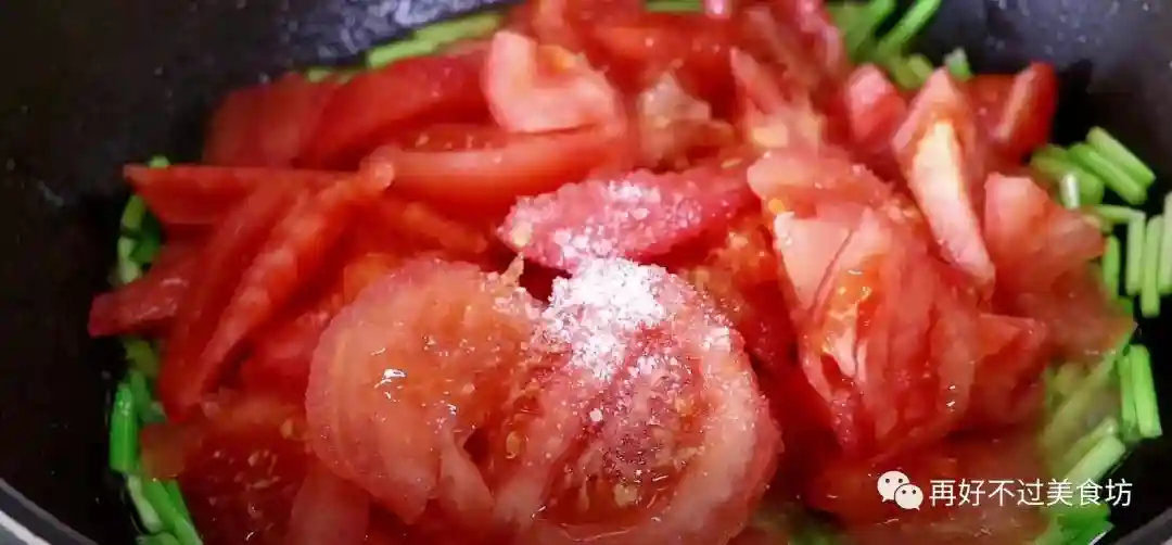 6、起锅烧油,热油爆一下韭菜根,再倒入番茄块,加入一小勺盐,这样可以加速炒出汁水。