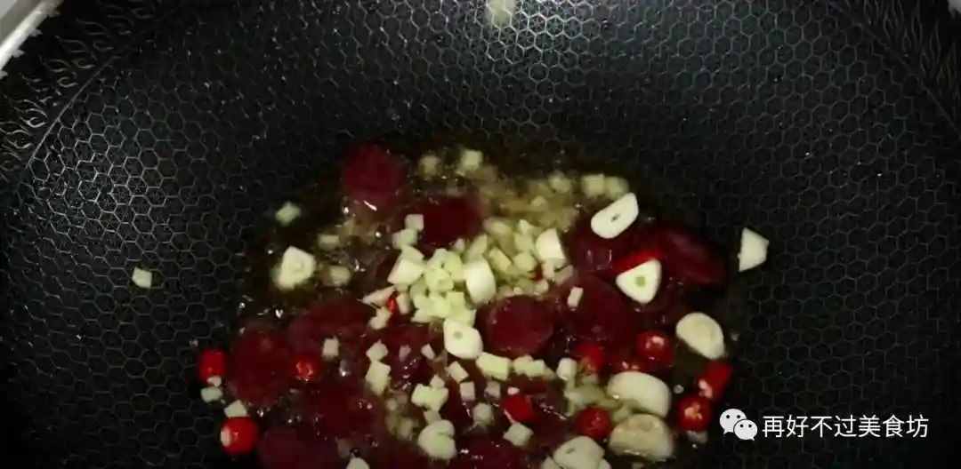 8、接下来在油锅里加入一勺猪油,这样吃起来更香,加上香肠,翻炒均匀,炒出香肠的油脂,炒香后,倒入准备好的小料翻炒均匀,炒出香味。
