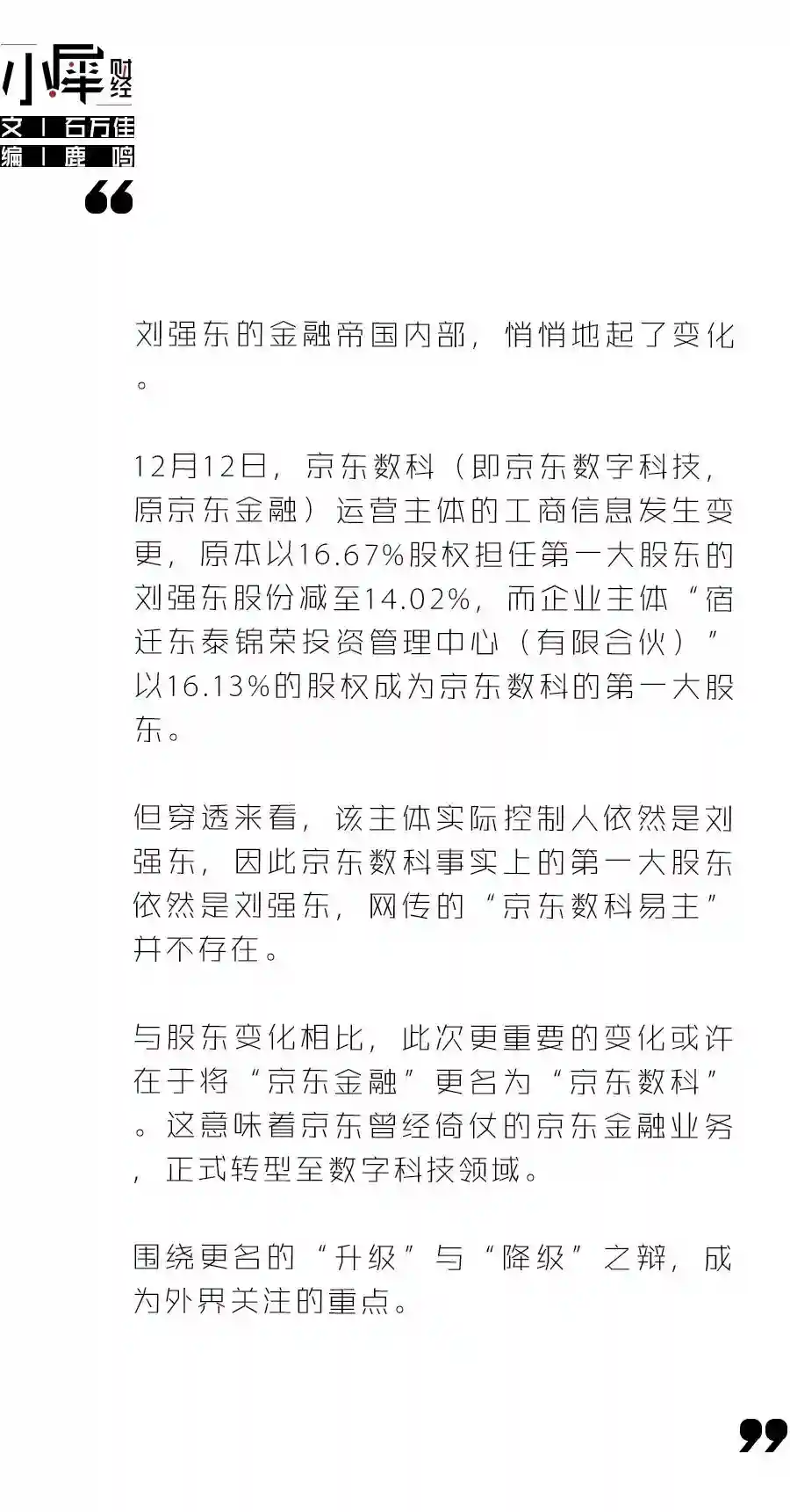 工商信息显示,12月12日,除股权结构之外,京东数科运营主体的企业名称、注册资本、股东及股比等多项信息均有变更。
