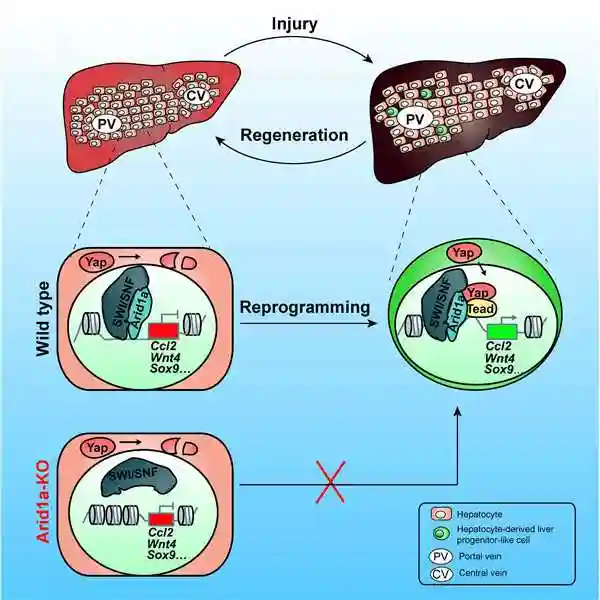 在该研究中,科研人员发现细胞核中的Arid1a蛋白调控了肝细胞的重编程。敲除Arid1a的肝细胞在门静脉肝脏损伤后不再“逆生长”,导致肝脏的损伤修复出现缺陷。